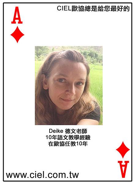 Deike Lautenschlaeger (女,德國籍) 歐協專任德文教師,大眾傳播學系碩士,曾於電視台服務數年,擔任記者職位表現傑出,精通英文及俄文,法文也有一定基礎,是一位相當有經驗且擅長帶動班級氣氛的老師。