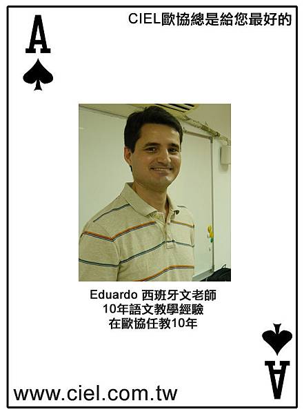 Eduardo Moreno (男,委內瑞拉籍,2004年任職) 歐協專任西班牙文教師,10年語文教學經驗。通英文。