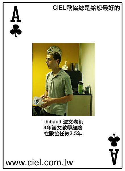 Thibaud Penicaud (男,法國人,2012年任職) 歐協語文法文專任教師,Poitiers 大學社會學學士、Provence Aix-Marseille 第一大學亞洲研究碩士以及法語教學(French as a Foreign language) 學位。Thibaud 也具有法文語言測驗Delf A1至B2監考資格。